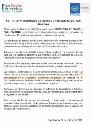 El Ministerio de Educación de El Salvador en un comunicado reciente ha publicado que las clases siguen suspendidas a nivel nacional para los centros escolares públicos y privados hasta el día lunes 15 de octubre, Dejando a consideración de las instituciones de educación superior la suspensión de sus clases. por tanto El Instituto Tecnológico de Chalatenango ITCHA-AGAPE informa: