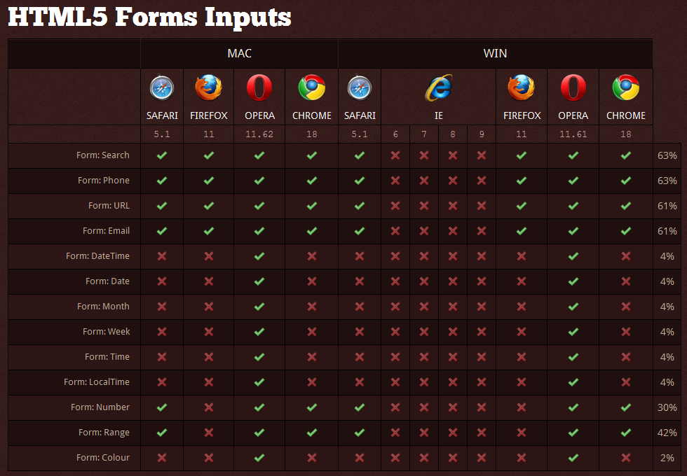 Nivel de compatibilidad de algunas etiquetas HTML5 en su aparición en el año 2012, nuestro buen Internet Explorer estaba a cero.