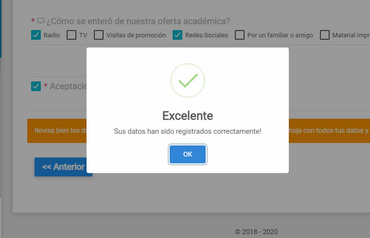 Una vez hayas agregado toda tu información haz clic en el botón GUARDAR MIS DATOS y si todo está bien, te indicará en un mensaje que el registro se ha completado correctamente, posteriormente puedes realizar la impresión de tu Hoja de Datos
